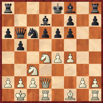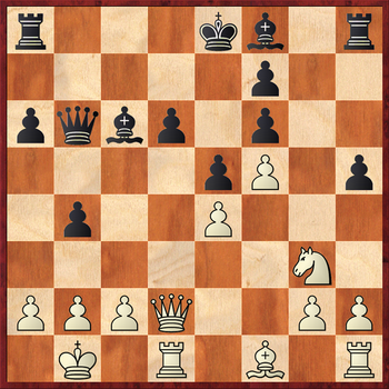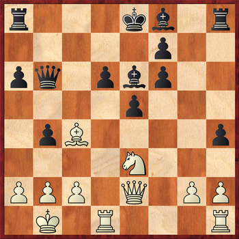 В подавляющем большинстве случаев здесь играют 16.h4. Так, в партии С.Иермито – Ю.Елисеев (Турция 2013) далее последовало: 16…Qc5 17.Qe2 Ke7 18.Nxh5 Bb5 19.Qg4 Bh6 20.Bd3 Bc6 21.Qe2 Qe3 22.Qxe3 Bxe3, и черные постепенно переиграли соперника.
