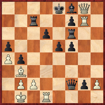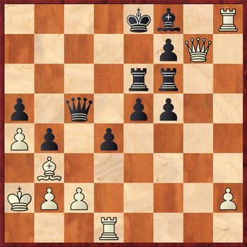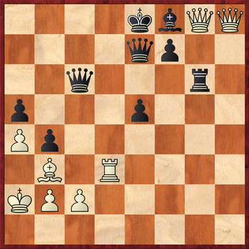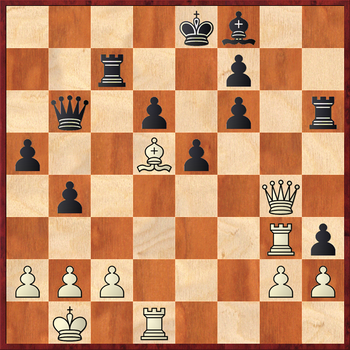 Белые проявляют исключительное хладнокровие и изобретательность в атаке, оставляя в живых пешку g2. Тактическим обоснованием их замысла служит вариант 30...Qf1? 31.Rh8! Qxd1+ 32.Ka2 Kd7 33.Qxf8 Re6 34.Qd8+ Kc6 35.Qa8+ Kd7 36.Rd8+ Ke7 37.Rg8! Kf6 (к мату ведет 37...Kd7 38.Bd5! b3+ 39.cxb3) 38.Qxg2 с выигрывающей атакой.